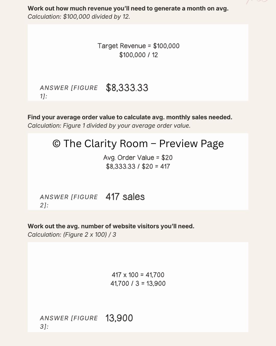 Instead of vague goal-setting, this workbook walks you through the actual numbers behind your revenue target—monthly income, average order value, website traffic, and conversion rate—then helps you build a practical execution plan around them.