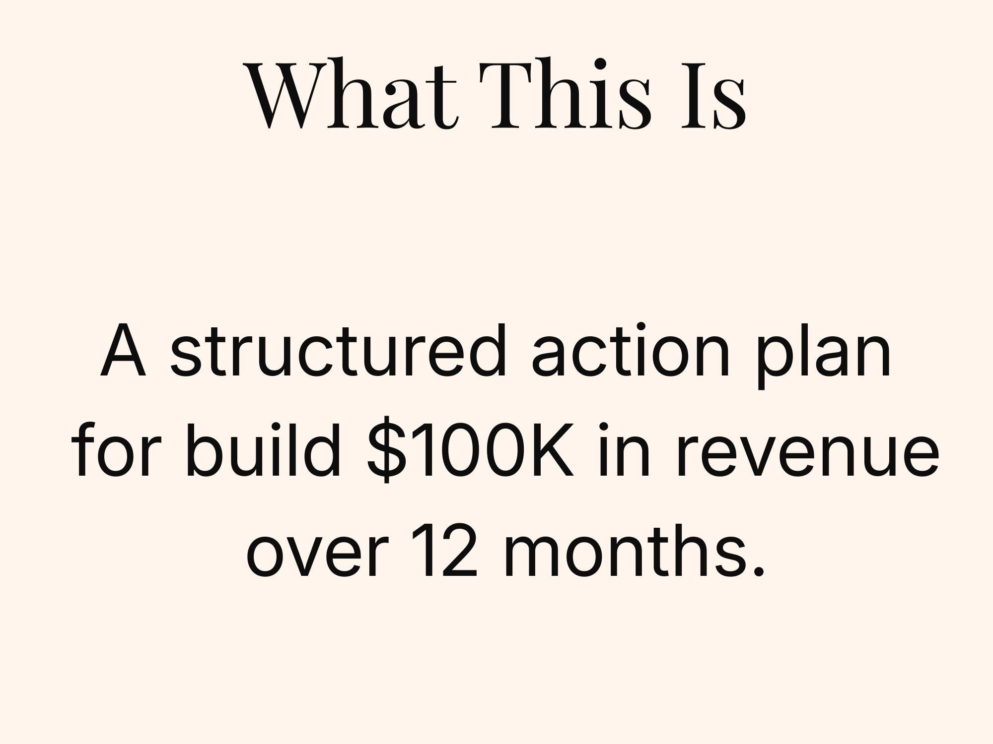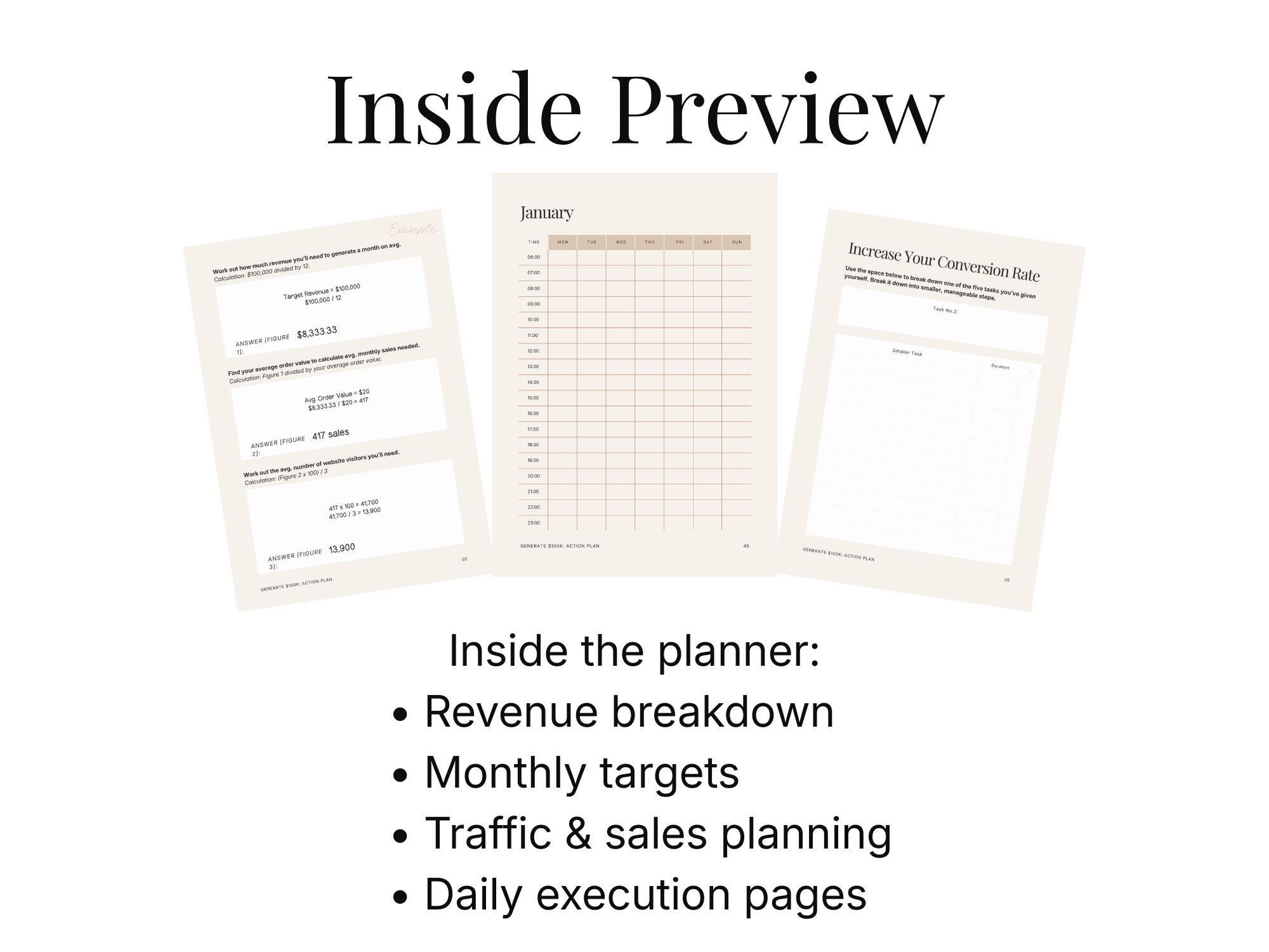 This business planner is a 12-month revenue strategy workbook designed to help entrepreneurs build a clear, realistic path to $100K. Inside, you’ll break down your income goals, traffic strategy, sales planning, and monthly execution—without fluff or guesswork.